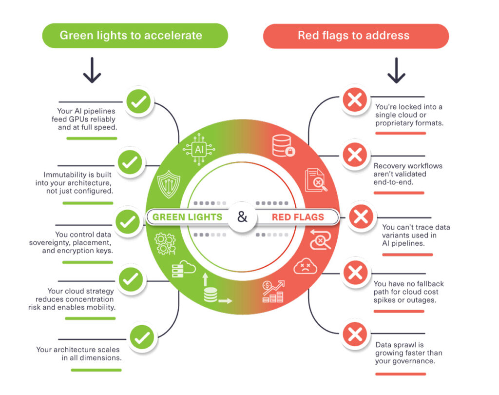 753 From outages to AI failures, 2025 revealed exactly where infrastructure struggled and where it held up. AI workloads exposed data pathways that couldn’t keep pace. New sovereignty rulings made jurisdictional control a measurable requirement. Cloud outages highlighted operational and economic concentration risk. And cyberattacks continued to test whether resilience strategies actually worked under real pressure. As organizations prepare for 2026, the focus has shifted from adding more tools to strengthening the core architecture that governs data integrity, mobility, and recovery. Storage now sits at the center of that equation, where security, compliance, and performance converge. This Data Readiness Scorecard distills the past year’s most important signals into two categories: Green lights indicate your data foundation is ready for the year ahead. Red flags show where hidden risks in control, resilience, or governance remain. The goal isn’t to predict the 2026 trends that will shape data infrastructure. It’s to help IT leaders diagnose where their architecture stands today and where reinforcement is needed. Download a copy of the 2026 data readiness scorecard checklist here, and read on as we get into the details. Green lights for 2026 1. AI readiness supported by high-throughput, governed data pipelines Why it matters: AI outcomes are constrained by data pipelines, not model ambition. In 2025, many organizations discovered that GPUs sat idle while storage systems struggled with throughput, metadata concurrency, or small-object access. Others discovered that without a clear data history, AI results couldn’t be trusted or validated. The teams that progressed fastest invested in pipelines designed for scale, concurrency, and governance, not just raw performance. 2025 news signal: AI failures trace back to missing data lineage MIT Technology Review: “AI models fail in unpredictable ways when organizations cannot trace or verify the data used to train them.” You are AI-ready if your environment supports: Fast, predictable data delivery to maximize GPU utilization High metadata concurrency and rapid small-object access Reproducible pipelines with end-to-end lineage Efficient management of billions of object variants Policy-driven mobility across fast, warm, and cold data tiers This is no longer advanced architecture. It is the baseline for reliable AI. 2. Deep immutability from API through architecture Why it matters: AI-accelerated ransomware exposes how quickly attackers adapt. Surface-level immutability is no longer enough. Clean, verifiable recovery requires immutability engineered into the storage architecture, not applied as a configuration toggle. Organizations embracing deeper resilience stayed ahead of both threats and insurance requirements. 2025 news signal: AI-generated ransomware surges Wired Magazine: “AI-assisted malware is now probing APIs and identity systems directly, accelerating the speed and sophistication of attacks.” Your environment is resilient if it includes: API-level retention enforcement System-level immutability that cannot be bypassed Cryptographic integrity or lineage verification Automated clean-restore testing A multi-layer cyber-resilience model aligned with CORE5 principles 3. Sovereignty-driven design with real control Why it matters: 2025 marked a decisive shift: sovereignty became operational, not conceptual. A court ruling involving French cloud provider OVHcloud made it clear that contractual data residency alone does not satisfy jurisdictional requirements (see below). Enterprises now need proof of where data lives, how it moves, and who controls it — especially in Europe, the Middle East, and regulated industries. 2025 news signal: Canada court vs. OVH The Register: “The court ruled that storing data in foreign regions under a Canadian contract still violates residency requirements.” You are sovereignty-ready if you support: Customer-owned encryption keys Region-locked placement aligned to jurisdiction Audit-ready lineage and data movement history Avoidance of hyperscaler concentration risk Compliant data mobility across cloud, on-prem, and edge 4. Cloud-smart resilience that reduces concentration risk Why it matters: Outages and cost volatility exposed the fragility of single-cloud dependence. Resilient organizations now design for independence, ensuring availability and control even when a major provider is disrupted. 2025 news signals: Cloud concentration recognized as a top global business risk Gartner Group: “Gartner ranks cloud concentration among the top five emerging business risks worldwide.” AWS outage exposes single-region fragility BBC News: “Those who had a single point of failure in this Amazon region were susceptible to being taken offline.” Your architecture signals cloud-smart resilience if it supports: Workload mobility across cloud, on-prem, and edge Alternative access paths to critical datasets Recovery operations that remain online during outages Workload placement based on performance, cost, and compliance Governance of security and configuration outside the cloud provider’s control Review Scality’s Cloud-Smart Resilience Checklist for additional details on the five principles listed here. 5. Multiscale, disaggregated architecture that adapts under pressure Why it matters: AI, analytics, and multi-tenant environments stress infrastructure in different ways at the same time. Traditional, tightly coupled systems hit tradeoffs that stall scale. Disaggregated, multiscale architectures enable independent scaling of compute, capacity, metadata, and transactions, making them essential for today’s unpredictable data demands. You can learn more about disaggregated and multiscale storage architecture in this 15 minute primer on the Jon Myer podcast: 2025 news signal: Industry pivots toward disaggregated designs TechTarget “Storage vendors are racing to deliver independently scalable compute and
