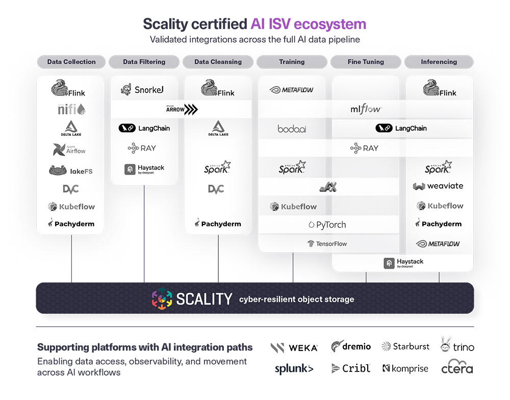 26 The hardest part of building AI isn’t designing the model — it’s stitching together the dozens of tools that feed and run it. This challenge, known as toolchain fragmentation, stretches from data ingestion pipelines to model training, fine-tuning, and inference. Organizations often end up piecing together a patchwork of tools that don’t play well together. The result is added complexity and delays of 40–60%, a costly slowdown in a market where speed is everything.If you’re a Scality RING XP customer — or considering becoming one — our certification program helps you cut through that complexity. More than 20 tools have already been validated to work seamlessly with Scality for ingestion, orchestration, data management, model development, and deployment. That means you can spend less time troubleshooting interoperability and more time driving AI results, backed by a data platform built for high-performance AI, cyber-resilience, and multidimensional scale. Here’s a closer look at the Scality-certified ecosystem, stage by stage across the AI pipeline. Stage 1: Data collection AI starts with data, capturing it from diverse systems, streams, and sources. Certified tools automate and scale this critical first step. Apache Airflow: Orchestrates and schedules complex pipelines, making data workflows repeatable and reliable. Apache Flink: Provides real-time stream processing for event-driven data, enabling instant insights from high-volume feeds. Apache NiFi: Automates ingestion and data flow management with strong lineage and monitoring across diverse systems. Delta Lake: Adds transactional reliability (ACID compliance) to data lakes, ensuring consistent collection at scale. DVC (Data Version Control): Integrates with Git to track datasets and models for reproducible AI experiments. Kubeflow: Provides Kubernetes-native orchestration for data and ML pipelines, integrating tightly with modern AI stacks. LakeFS: Git-style versioning for massive datasets allows teams to branch and merge data just like code. Pachyderm: Ensures strong lineage and versioning, making every stage of data collection auditable and compliant. Stage 2: Data filtering Once collected, data must be filtered, structured and enriched to become useful for model development. Certified filtering tools accelerate this critical stage. Apache Arrow: An efficient, in-memory columnar format that accelerates filtering, analytics, and cross-system data interchange. Haystack: Provides filtering and retrieval for unstructured data, powering intelligent search and RAG pipelines. LangChain: Orchestrates data and models for LLM workflows, connecting data sources with AI applications. Ray: A distributed execution engine that powers data filtering, preprocessing, and large-scale ML tasks. Snorkel: Uses weak supervision to programmatically label datasets, dramatically reducing manual labeling overhead. Stage 3: Data cleansing Filtering helps structure data, but cleansing ensures reliability. This stage removes duplicates, fixes inconsistencies, and guarantees quality at scale. With certified cleaning tools, organizations can trust that training data is accurate, complete, and production-ready. Apache Arrow: Provides a standardized memory format for clean data interchange between tools without loss. Apache Flink: Cleans streaming data in-flight with real-time transformations and deduplication. Apache Spark: Powers large-scale ETL and distributed data wrangling for batch and streaming workloads. Delta Lake: Adds schema enforcement and data validation to keep lakehouse datasets consistent. DVC (Data Version Control): Tracks cleaned datasets with reproducible lineage to avoid “dirty data drift.” Pachyderm: Automates cleaning workflows with containerized pipelines, ensuring every transformation is versioned and auditable. Stage 4: Training Training is where models take shape and become the heart of AI. Certified frameworks here support everything from rapid prototyping to production-grade training. Apache Spark – Scales distributed data processing and ML training. bodo.ai – Supercharges Python and ML workloads with compiler-level optimizations for extreme performance. JAX – Accelerates high-performance machine learning with automatic differentiation. Kubeflow – Orchestrates end-to-end training pipelines on Kubernetes. Metaflow – Simplifies model training workflow management by orchestrating data pipelines, experiments, and versioning to ensure reproducible and scalable machine learning processes. MLFlow – Manages model training, tracking, and experiment management, enabling reproducibility and streamlined collaboration across machine learning workflows. PyTorch – Enables dynamic, developer-friendly deep learning. Ray – Enables distributed compute engine powering training workloads across GPUs and clusters. TensorFlow – Delivers production-grade distributed training. Stage 5: Fine-tuning Fine-tuning represents one of the most critical stages in modern AI development, where pre-trained models are adapted to specific domains, tasks, or organizational requirements. Certified tools ensure this process is efficient and reproducible. Apache Spark: Enables distributed fine-tuning of machine learning models by parallelizing data processing and training across large clusters, improving scalability and efficiency for big datasets. Haystack: Supports fine-tuning and adaptation of language models for RAG pipelines, enabling domain-specific AI applications. JAX: Optimizes gradient-based fine-tuning and research experimentation with a high-performance numerical computing library. Kubeflow: Handles orchestration and distributed fine-tuning. LangChain: Streamlines framework for fine-tuning and chaining large language models with custom data sources. MLflow: Provides comprehensive experiment tracking and model lifecycle management to drive systematic fine-tuning workflows. PyTorch: Adapts pre-trained models with a flexible deep 