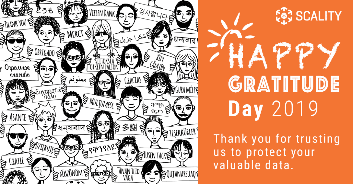 1K Brush your teeth after eating, put on clean clothes before going out, and appreciate what you have. Isn’t that what we teach our kids? I don’t know about you, but I do almost all of those things. Except I allow too few chances to slow down and be grateful for what I am and what I have. Even scientific evidence says that gratitude makes us happier, so I’m truly grateful for the reminder that comes with World Gratitude Day. World Gratitude Day came out of a celebration in Hawaii in 1965, according to DaysoftheYear. There are few details about the original group of people who gathered there, but as the story goes, when they went back to their homes after that celebration, they marked September 21st 1966 as Gratitude Day. And the tradition lives on. Legend or fact, any excuse is good for celebrating positive emotions. It turns out that expressing gratitude is a good way to become happy. According to an article on Harvard Health Publishing’s Healthbeat [bctt tweet=”In positive psychology research, gratitude is strongly and consistently associated with greater happiness. Gratitude helps people feel more positive emotions, relish good experiences, improve their health, deal with adversity, and build strong relationships.” username=”scality”] The word gratitude comes from Latin word ‘gratus’ which translates to pleasing, thankful. The Italian word for thank you (grazie) has the same root. According to Wikipedia, gratitude is a feeling of appreciation felt by and/or similar positive response shown by the recipient of kindness, gifts, help, favors, or other types of generosity, towards the giver of such gifts. People in the US and Canada celebrate Thanksgiving each year, albeit on different days. Since Scality is a multinational company we’re grateful (pun intended) to be able to celebrate multiple holidays. So here we are, the whole team at Scality joining the crowd online with thoughts of appreciation of what we are, individually and collectively as a company. We took some time off of our schedule to think about the positive impact that others have on our lives. Even if science cannot prove conclusively that people who frequently express gratitude are happier, it’s hard to see a downside, so we’re going to try to take every chance possible to feel and share gratitude. Express a little bit of gratitude today and every day: at worst, you’ll make others feel good, and you may even add to that a happier you.